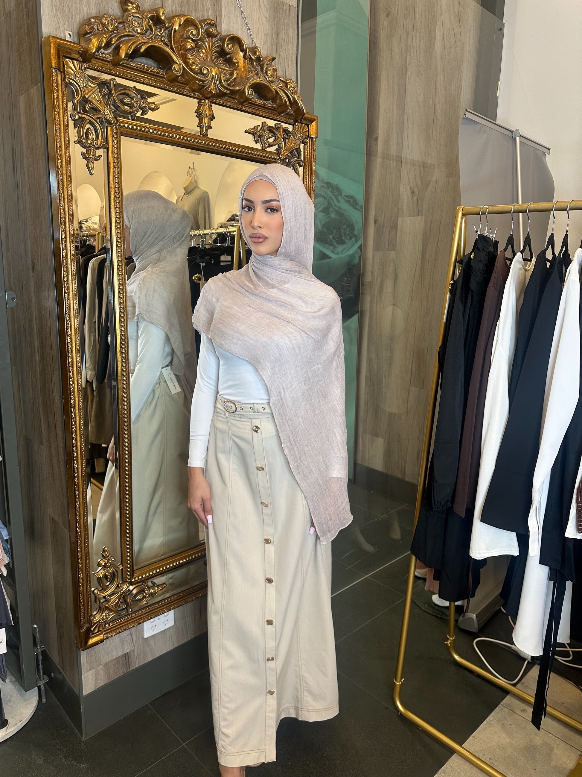 - Full-length button-down skirt featuring a vertical row of statement buttons