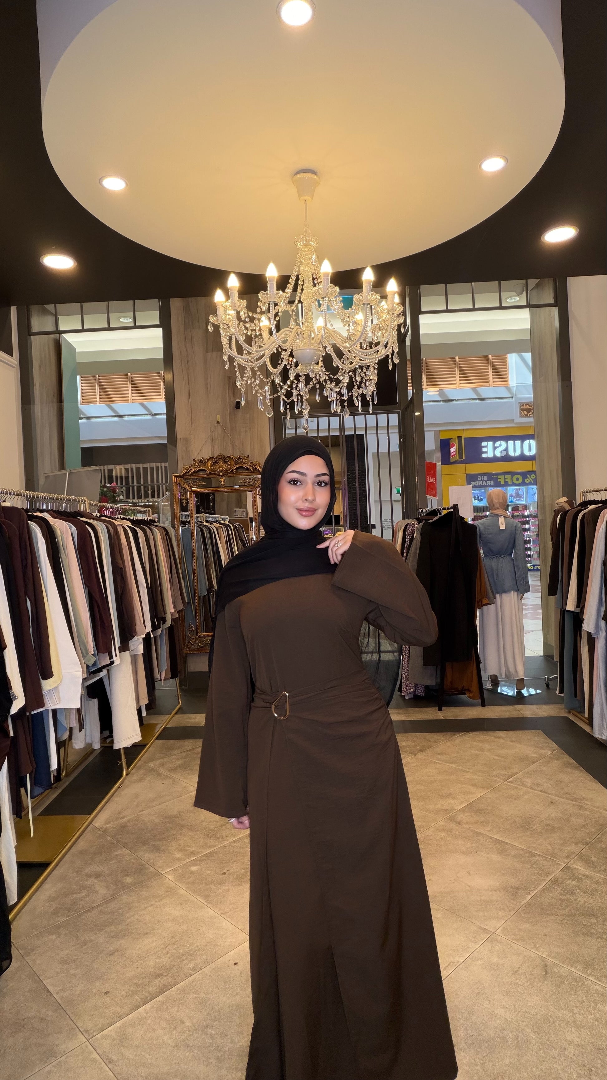 This dress is a long, modest style maxi dress in a soft mocha taupe shade. It features: