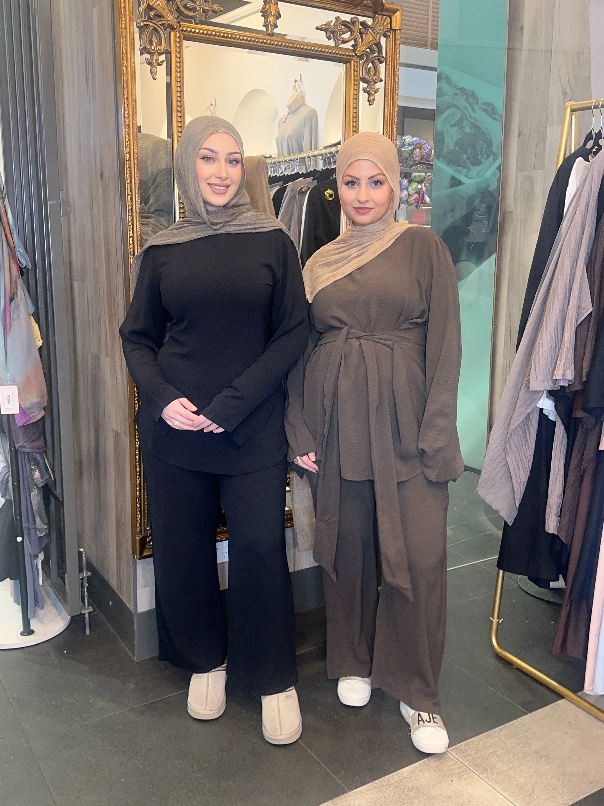 Our myra Two-Piece Set is the perfect blend of comfort and style. Designed with a relaxed fit, this set includes a long-sleeve top with a waist tie that allows you to style it in different ways, paired with straight-cut pants for a modest yet chic look. Made from a lightweight textured fabric, it’s breathable, flowy, and ideal for everyday wear or casual outings.