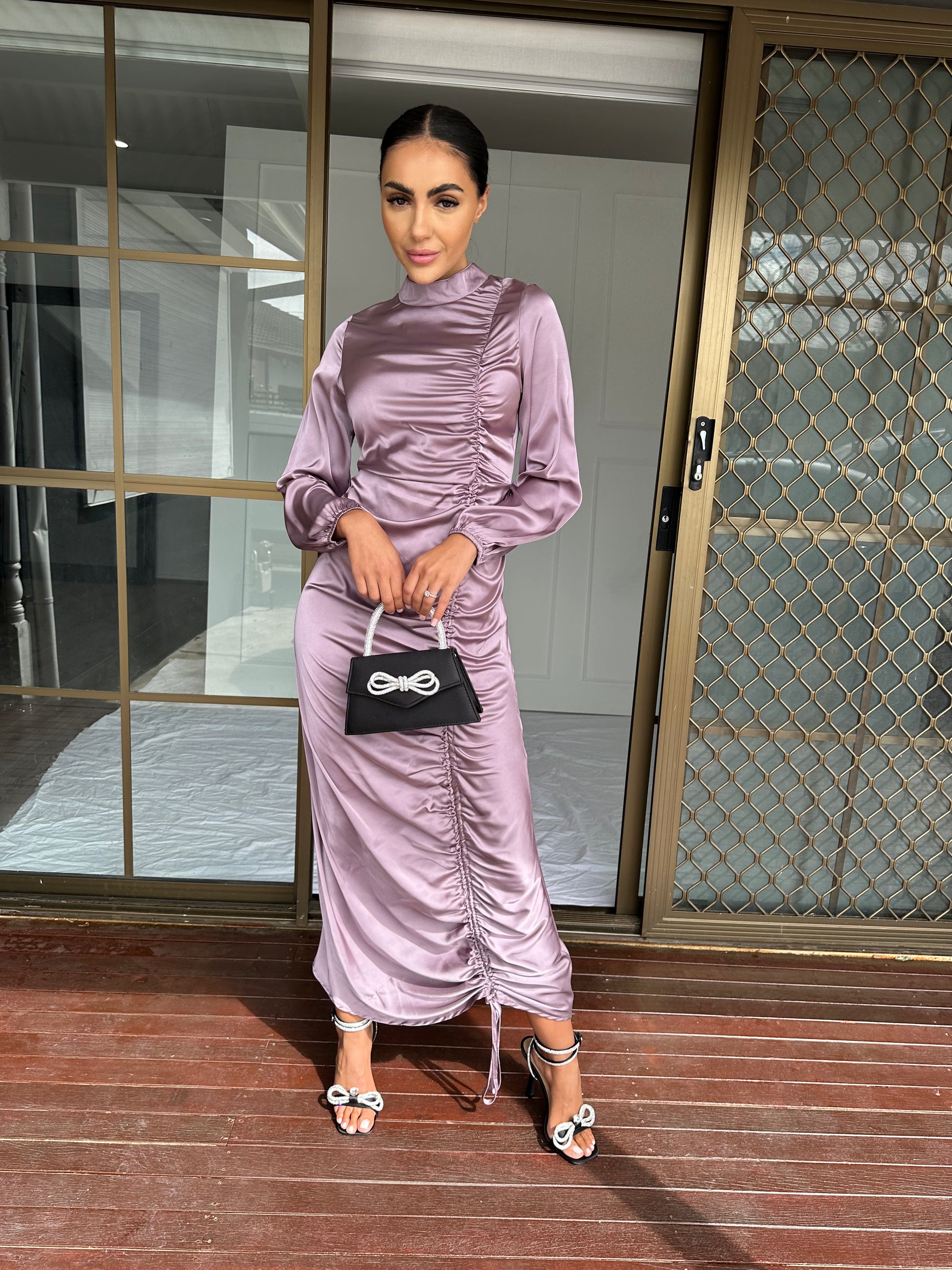 Look chic wearing the fashionable Valentine Side Drawstring Dress made of flowy material for maximum comfort. This artsy piece of fashion with a drawstring can easily be a style statement.Team it up with a strappy heel to elevate your look featuring high neckline side ruched detail that can be adjusted, elastic cuffs and invisible zip
