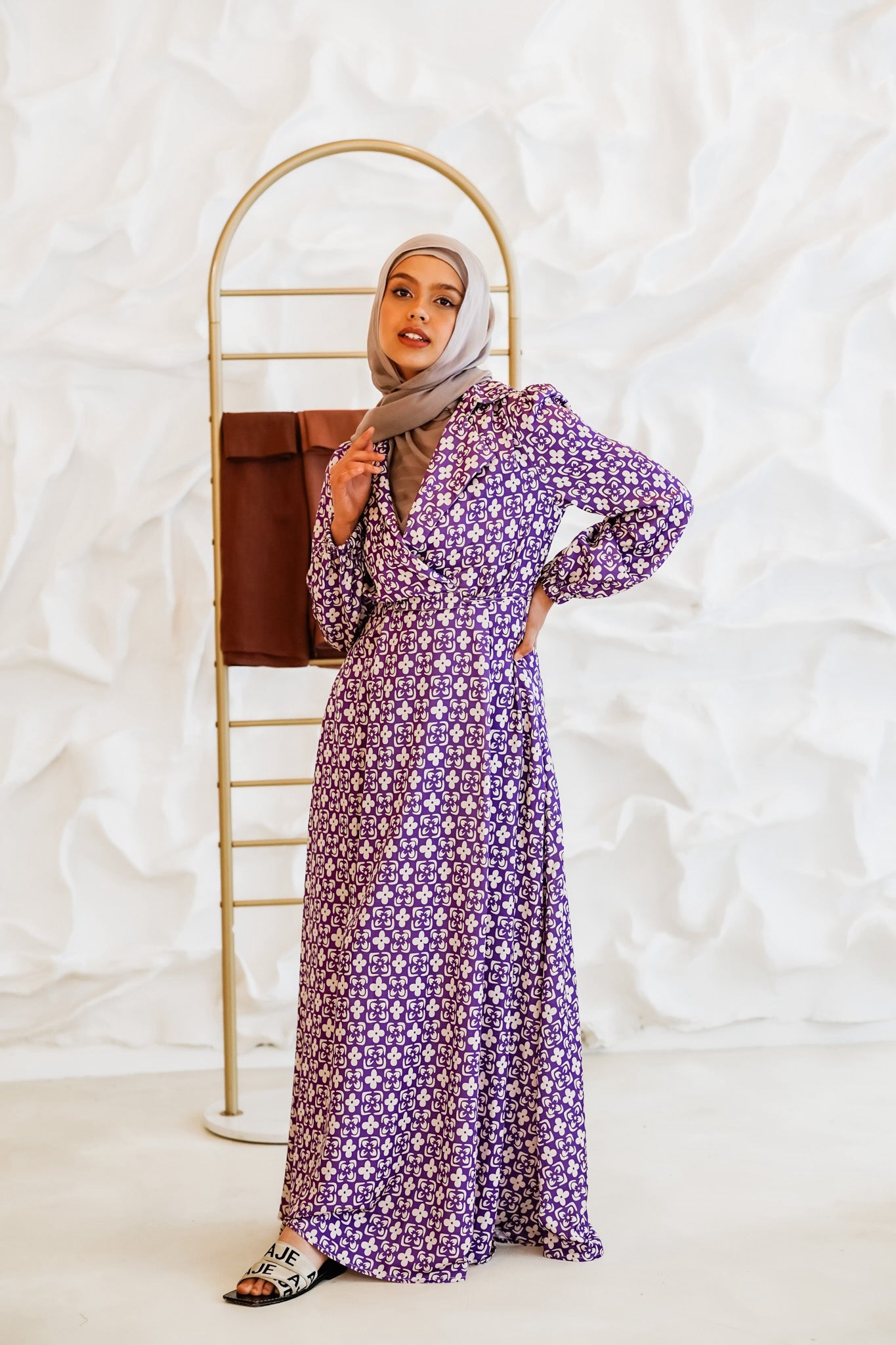 Natural beauty. Symmetrical florals captured in a geometric print speak to the delicate balance of nature. The sensual allure of a figure-enhancing at the waist is accentuated with a dimensional wrap-tie. The sultry elements of the design are balanced with balloon sleeves cinched in at the elbows and a billowing maxi skirt. The ultimate day-to-night staple, this dress can be worn with sandals for casual gatherings, or styled with heels for more elevated events. FIT: Relaxed fit with self-fabric tie at waist.
