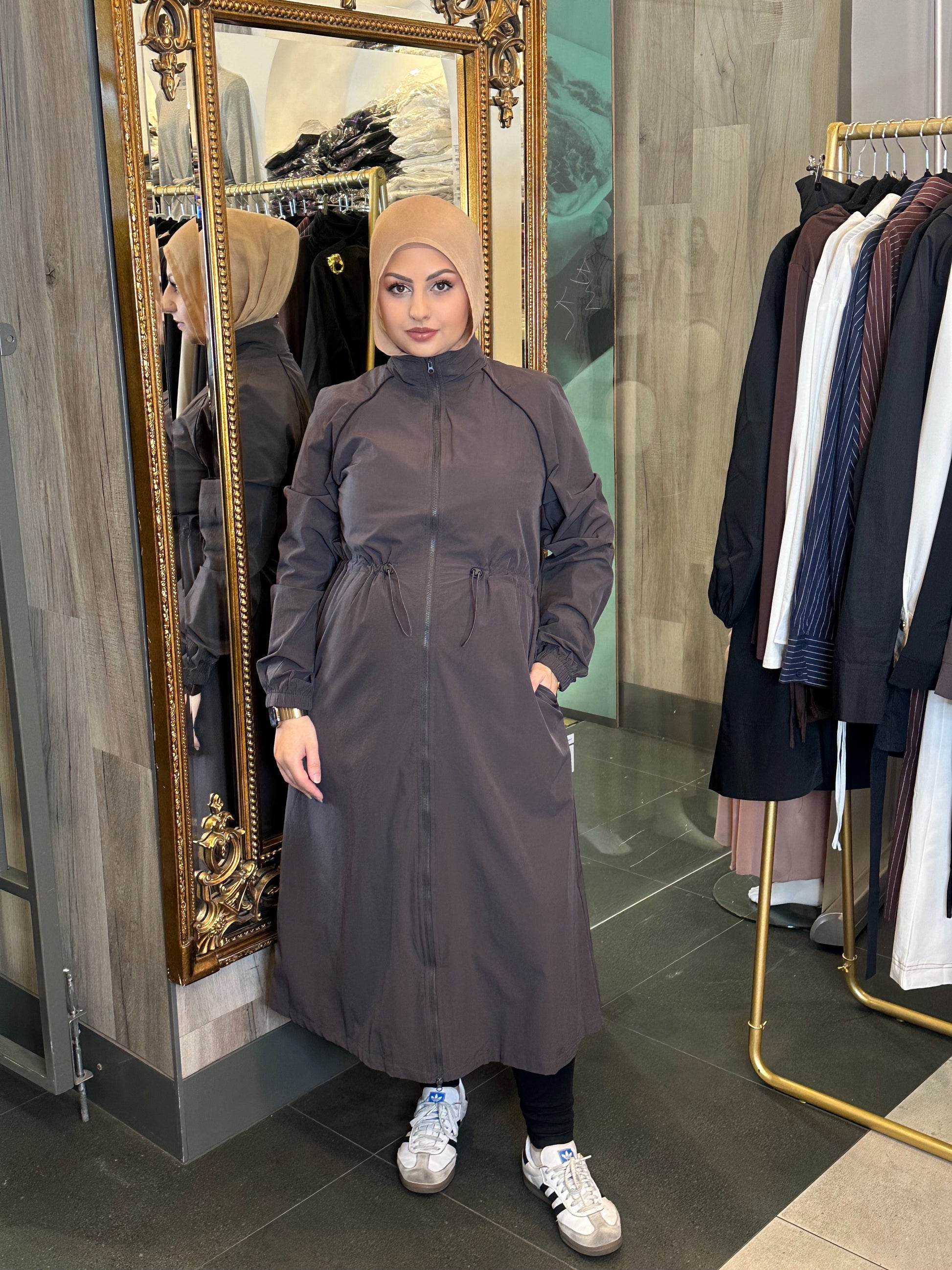 Combining function and fashion, this zip-up utility Jacket is the perfect blend of sporty and sophisticated. Featuring a high collar, full-length sleeves, and an adjustable drawstring waist, it offers a flattering A-line silhouette that suits all body types. The lightweight fabric drapes beautifully while remaining comfortable for all-day wear. With subtle seam detailing and a modest midi length, this jacket is ideal for casual outings, travel, or layering in cooler seasons.