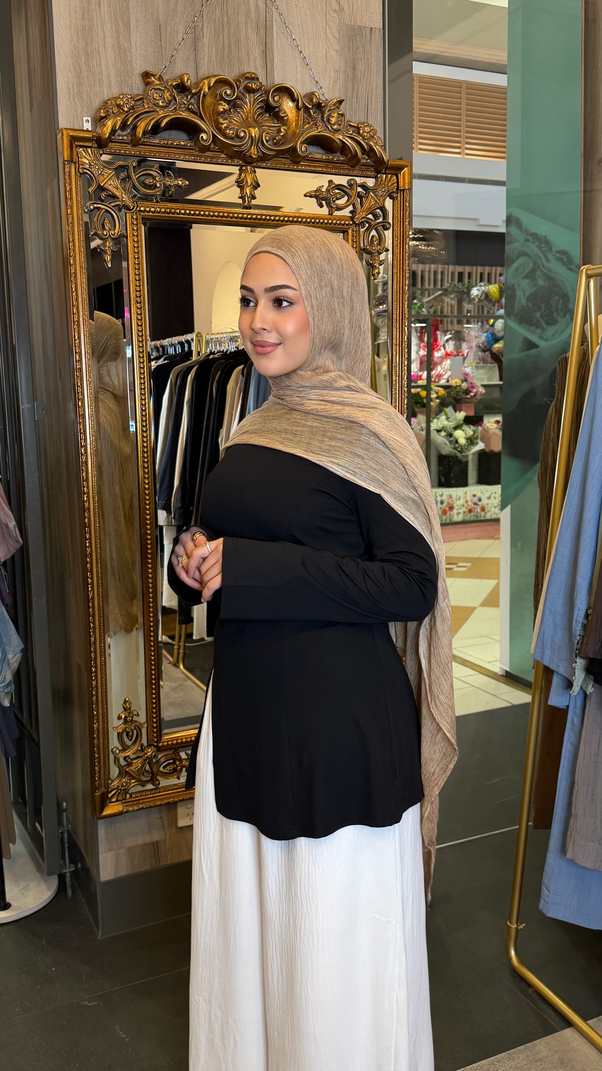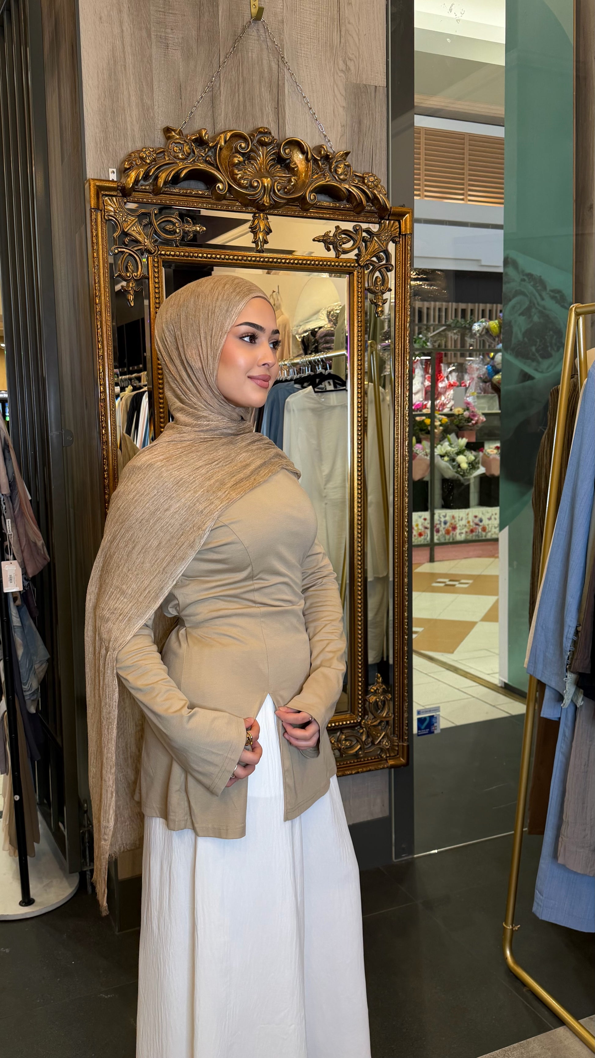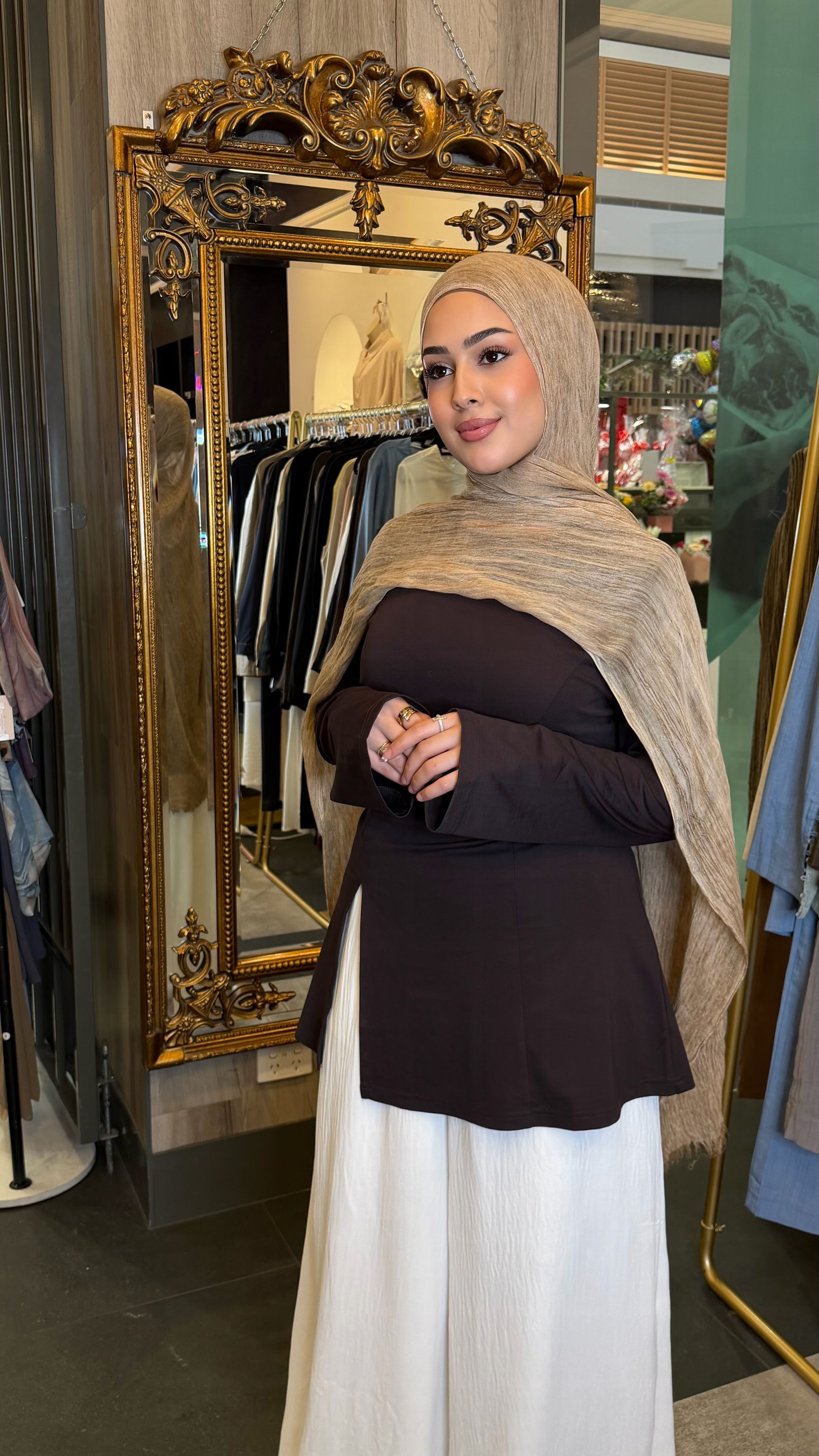 The Lina Split-Hem Tie Tunic is a timeless essential designed for effortless, modest styling. Featuring a classic round neckline and long sleeves, this top is tailored with subtle panel detailing to flatter the silhouette. The soft flare hem and front split provide ease of movement, while the detachable waist tie at the back allows you to adjust the fit to your liking.