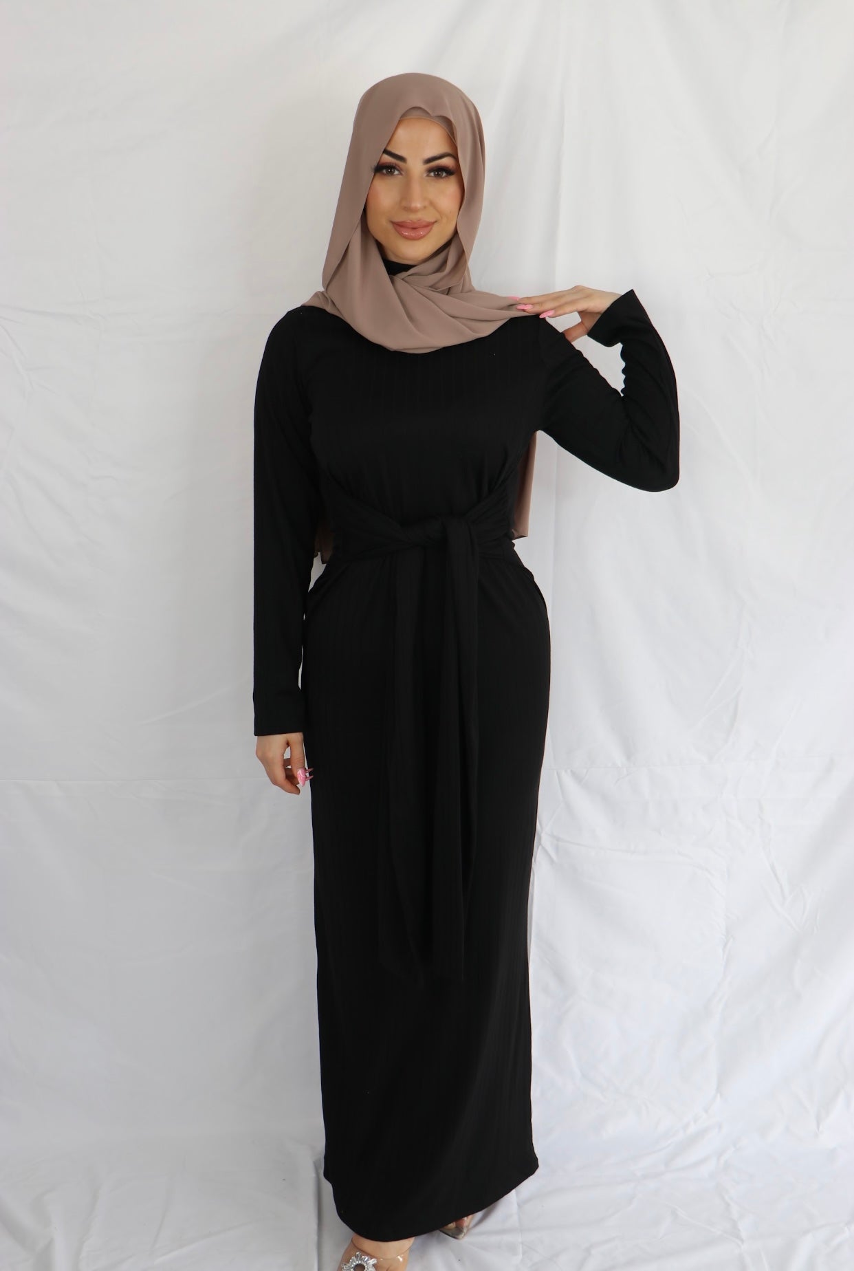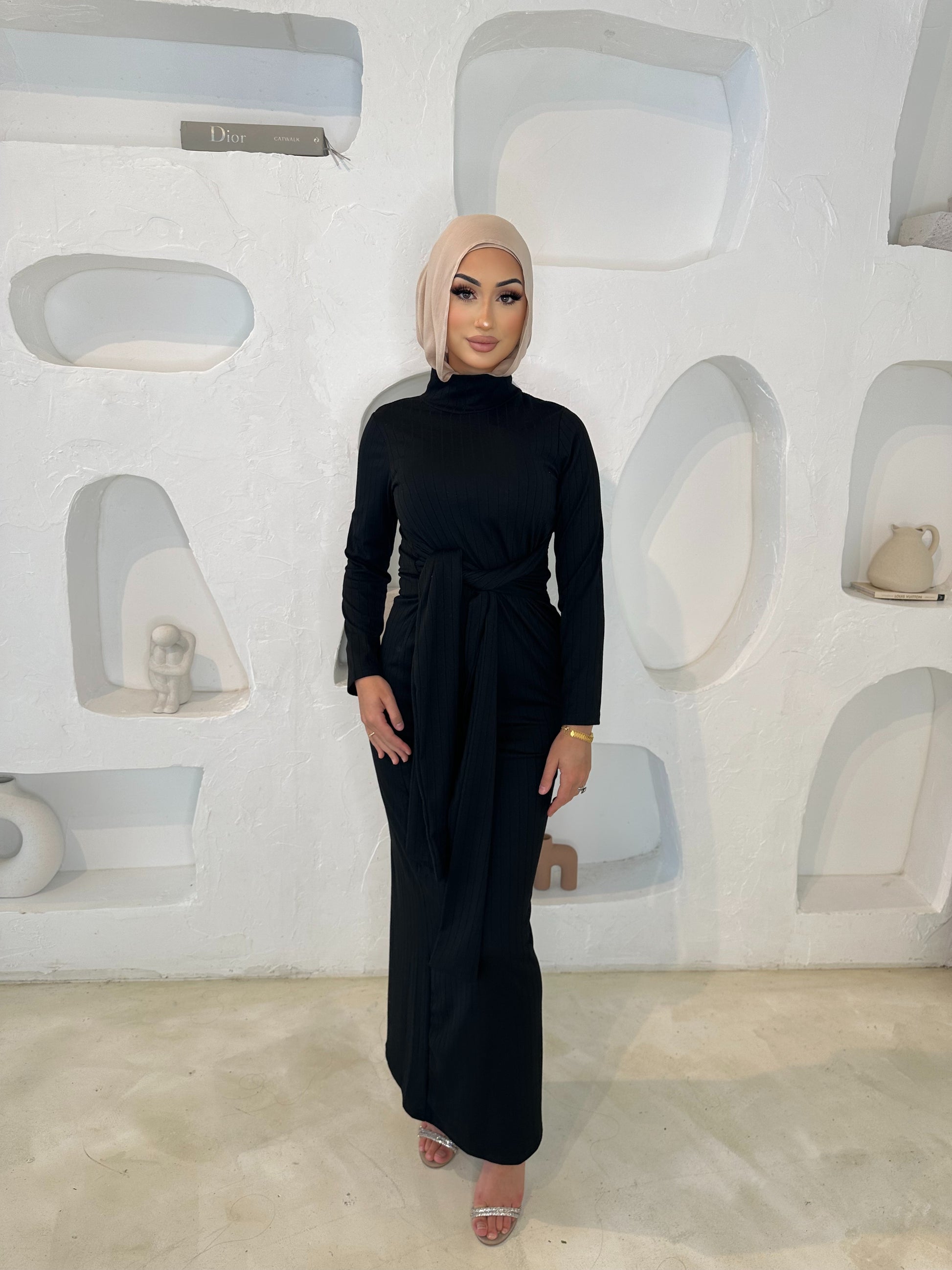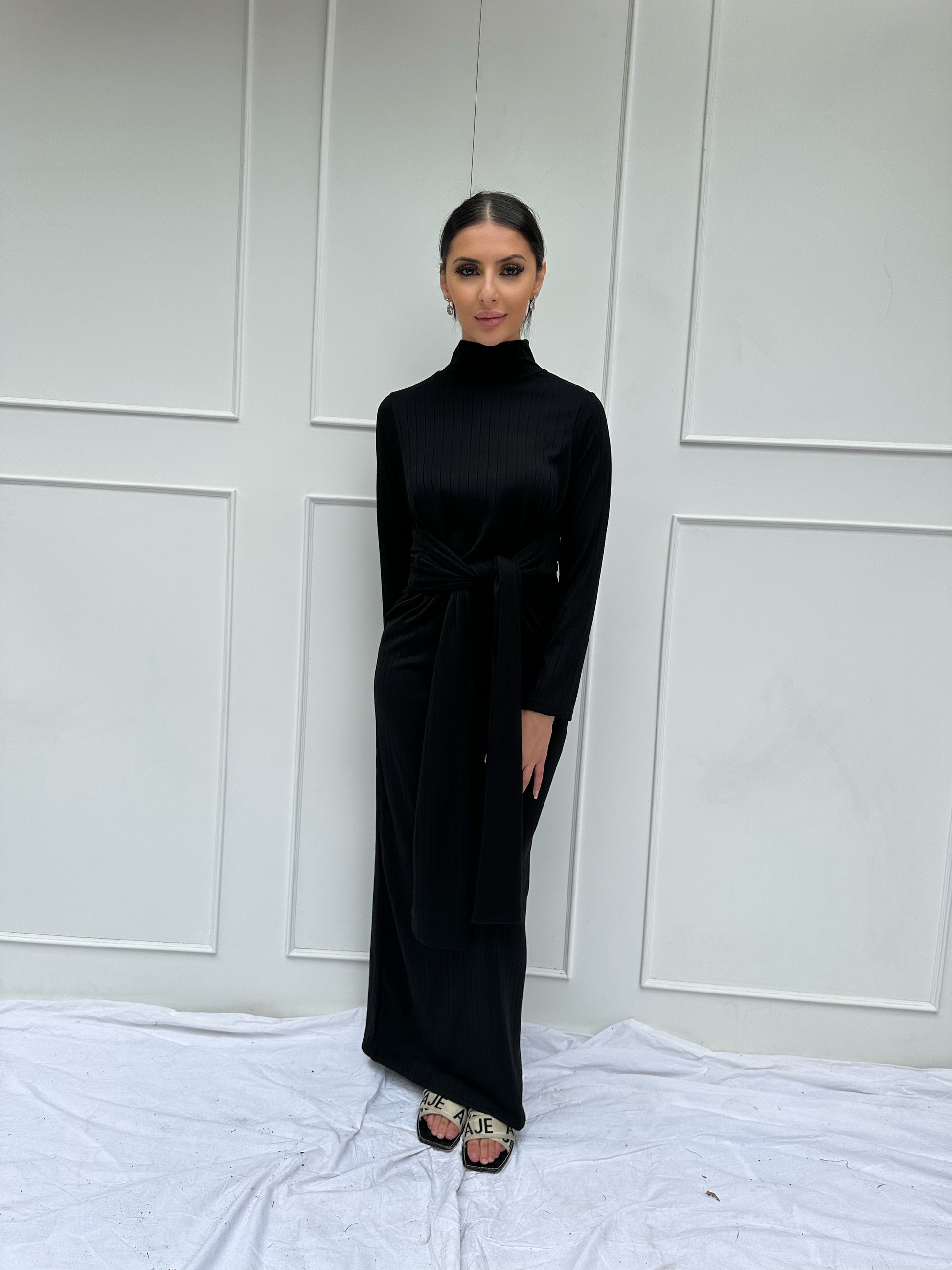 Ariana is a pinnacle of refined versatility, designed with sophisticated features you can effortlessly grace at different events. The front high round neckline is perfect for styling with dainty jewellery while the long sleeve detail makes it ideal for indoor or outdoor affairs. It is ribbed, meaning it can accommodate and complement any size or shape. Style it with simple strappy heels for a polished ensemble you can wear from office to dates