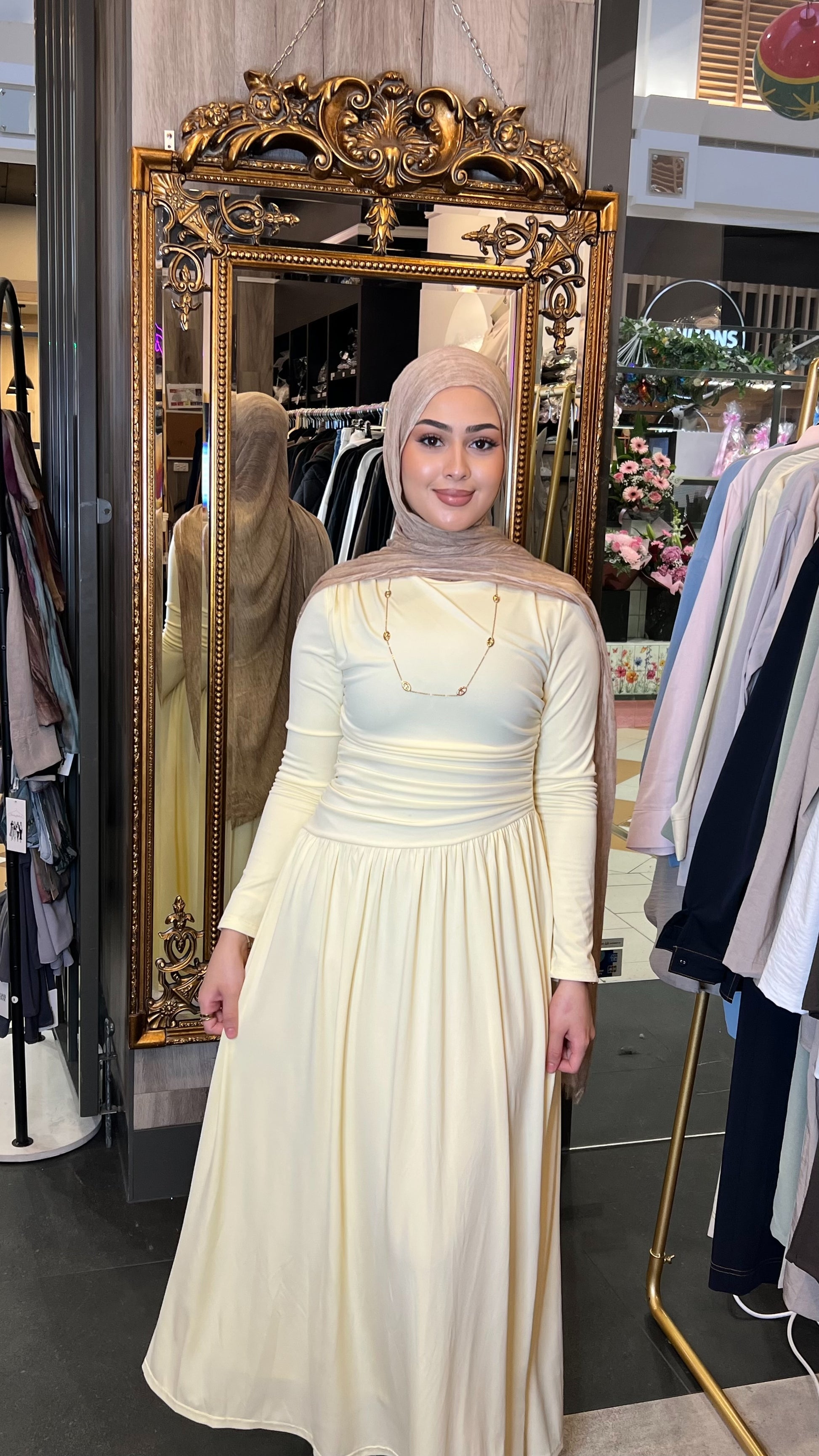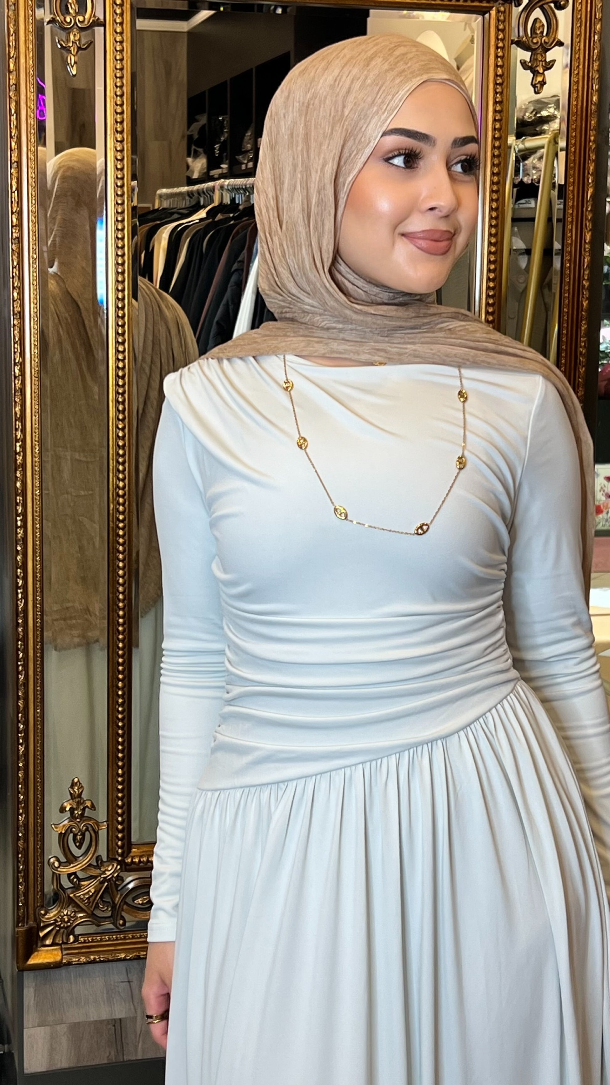 The waistline is slightly angled, flowing into a light, airy A-line skirt that moves gracefully with every step. Long sleeves and a high neckline ensure full coverage while still keeping the design modern and refined.