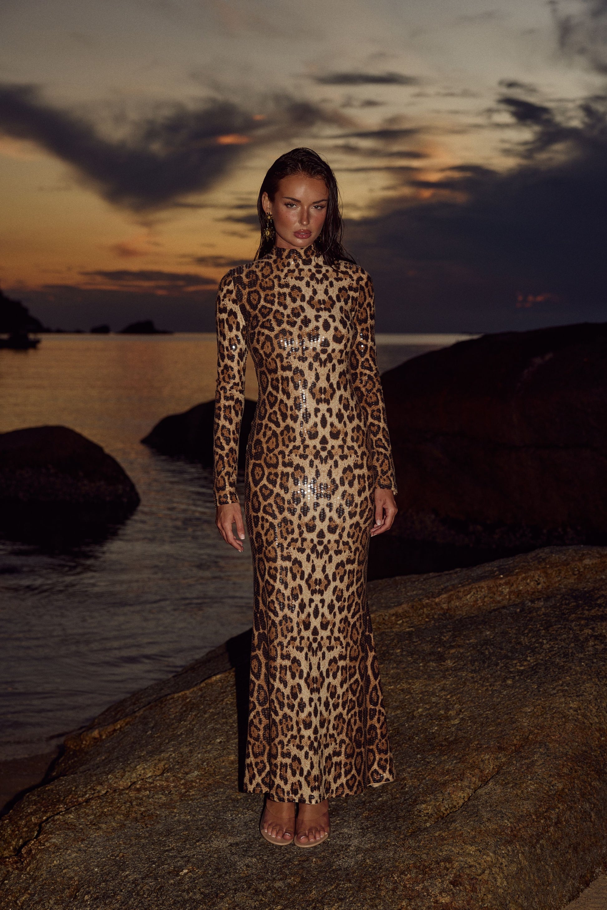 Our Saylor Maxi Dress features full length sleeves and a mock neck, in a leopard print and clear sequin overlay, this piece is perfect for your next after five event.