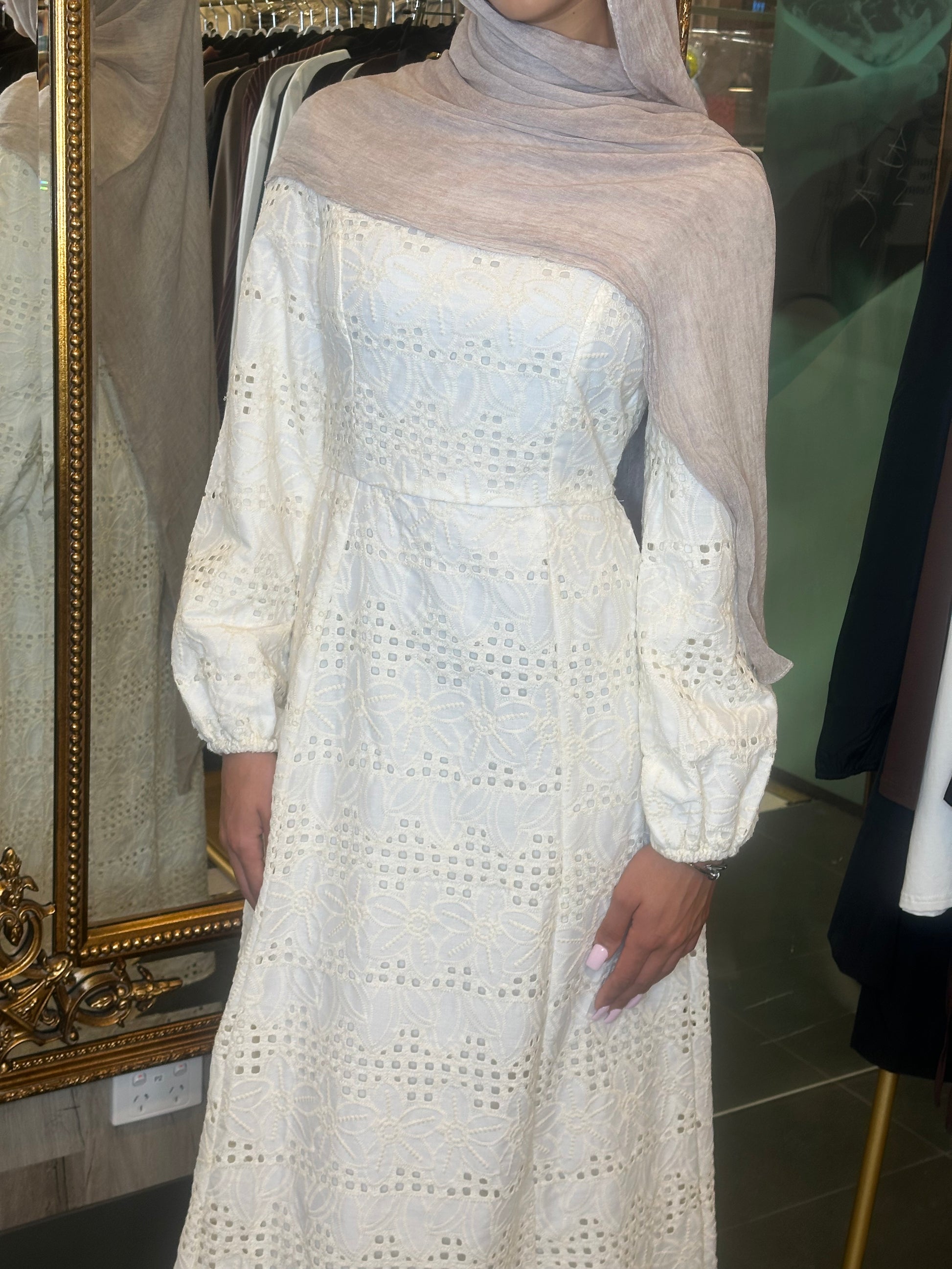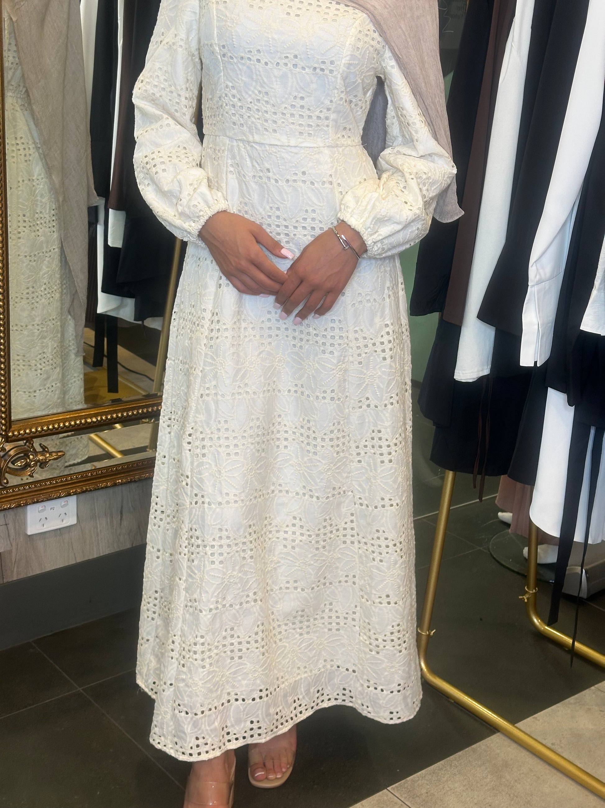 This stunning maxi dress features a beautifully detailed broderie anglaise (eyelet) embroidery, creating a feminine and elegant look perfect for both casual and special occasions.